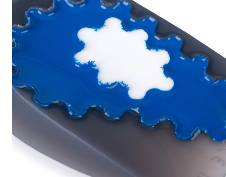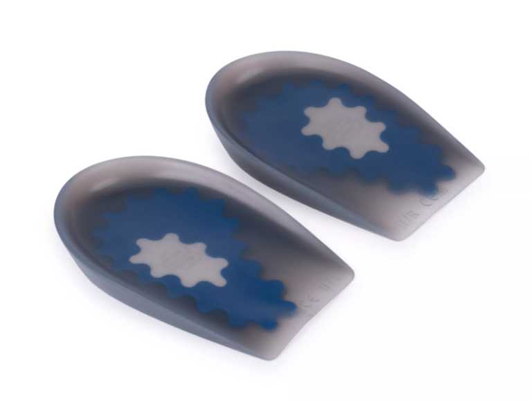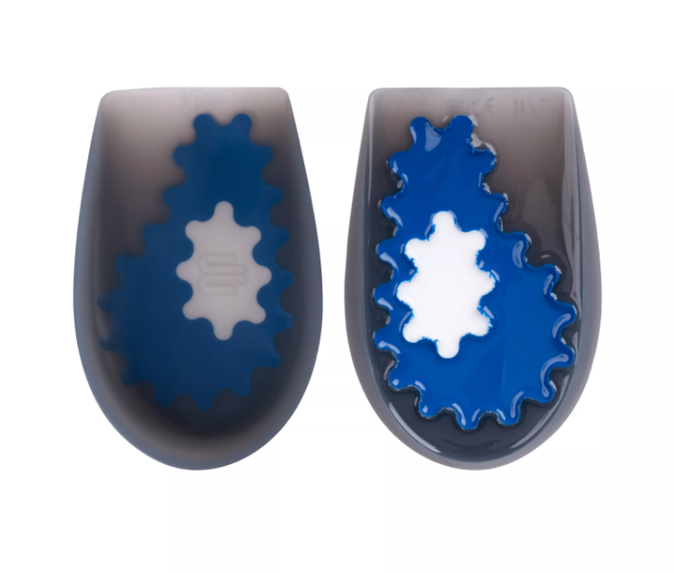 Подпяточник смоделирован анатомически. Звездообразное крепление синего участка обеспечивает плавный переход от более плотного материала к мягкому, снижая давление на краях. Участок силикона меньшей плотности расположен в проекции наиболее частой локализации пяточной шпоры и целенаправленно снимает нагрузку именно в этом месте.
